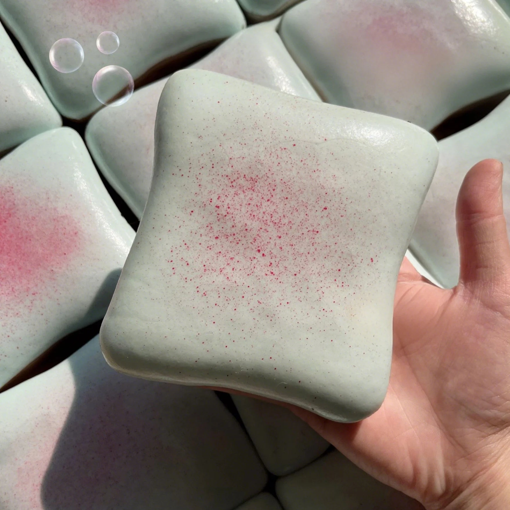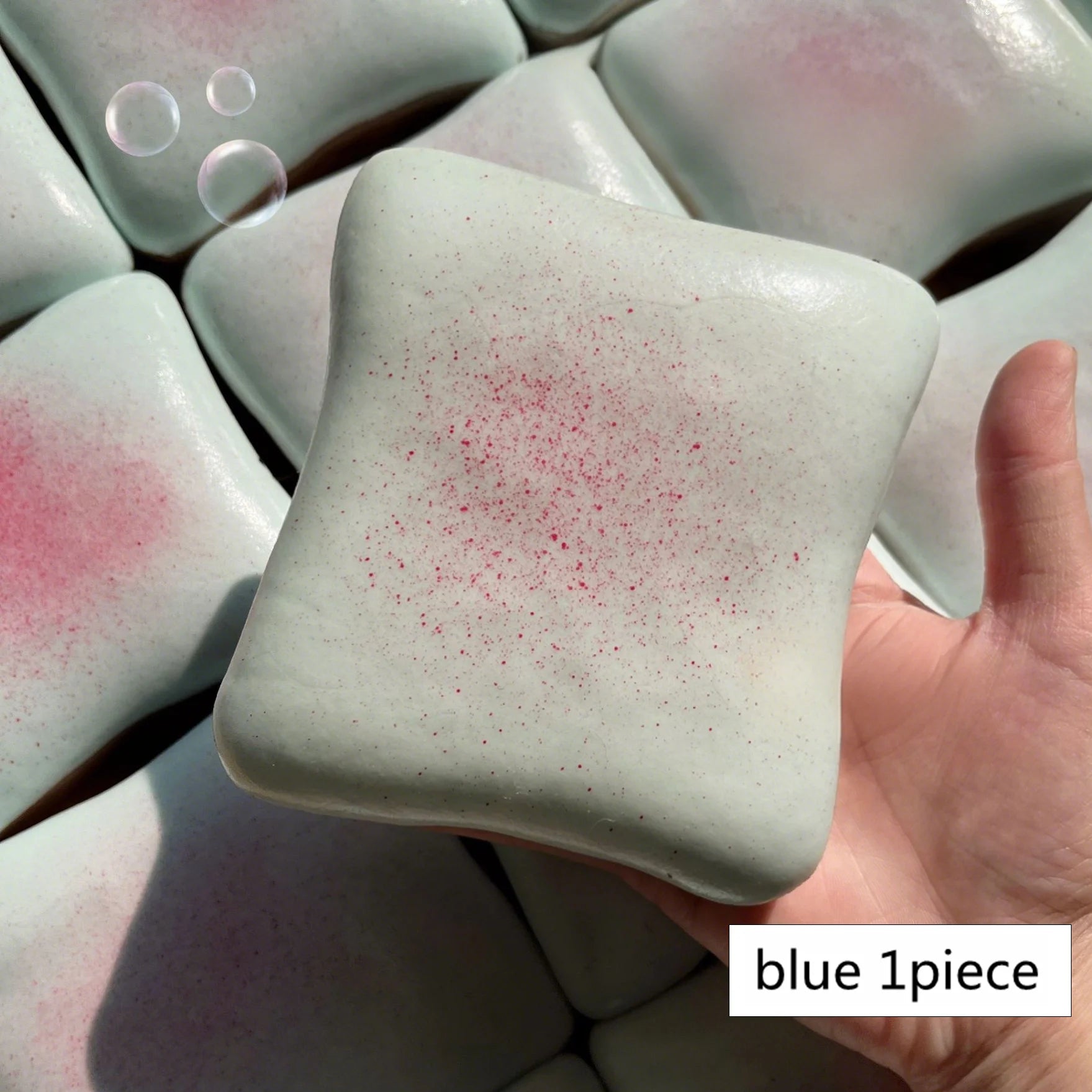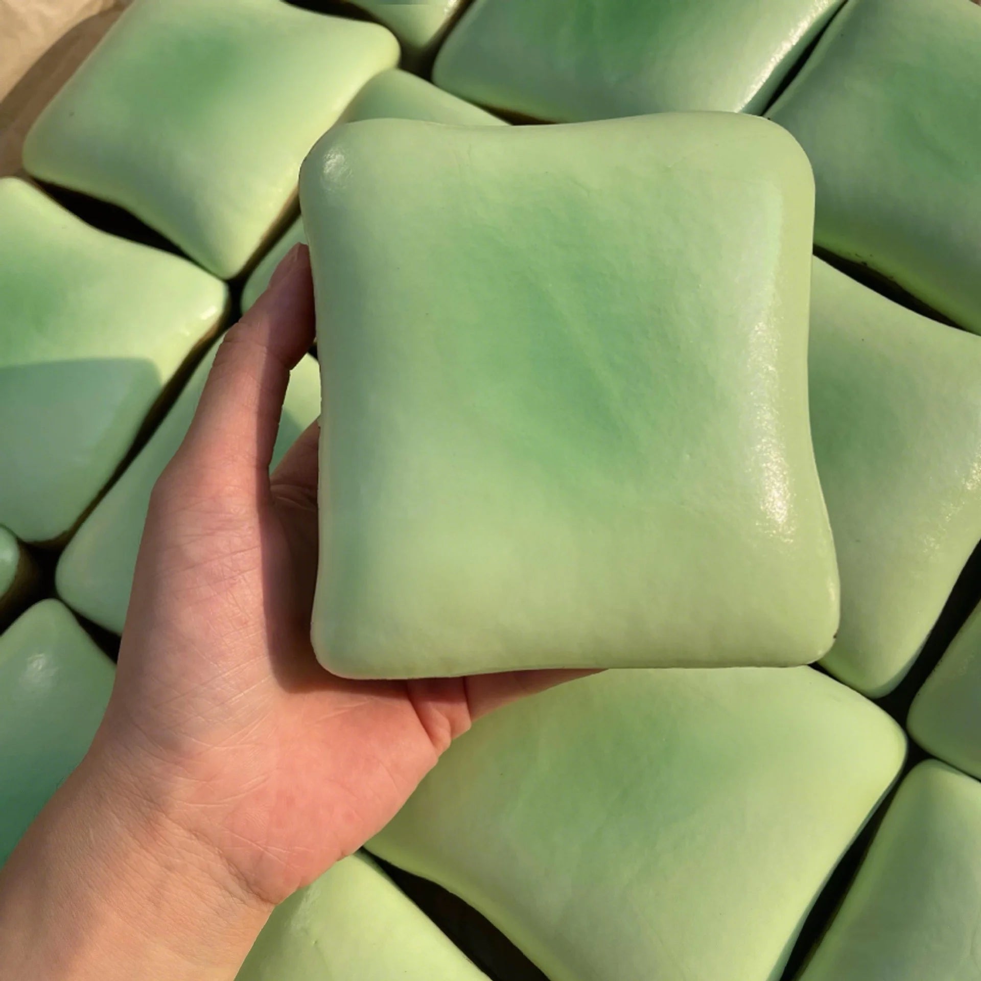 Su textura blanda y su efecto “slow rebound” (recuperación lenta) permiten apretarla y ver cómo vuelve poco a poco a su forma original, generando una sensación visual y táctil calmante.